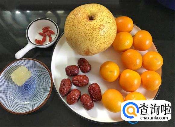 在制作金桔雪梨汤时,需要准备金桔、雪梨、红枣、枸杞、黄色的冰糖等等。