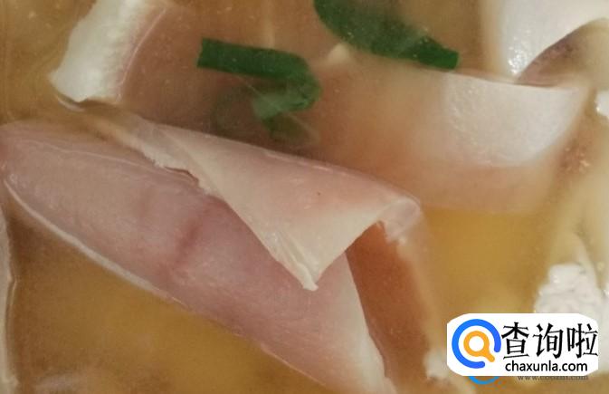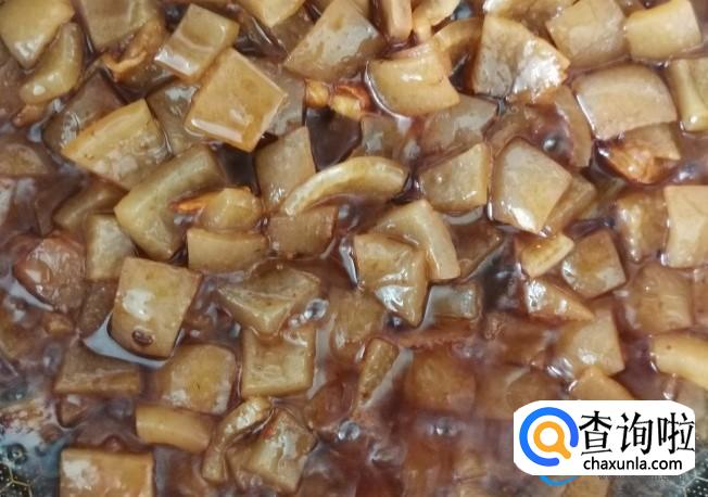 前期的准备工作,猪皮需要冷水下锅,锅中放入一片生姜、料酒,大概煮20分钟的样子,然后将猪皮捞出,冷却直接切成条放到一边备用。