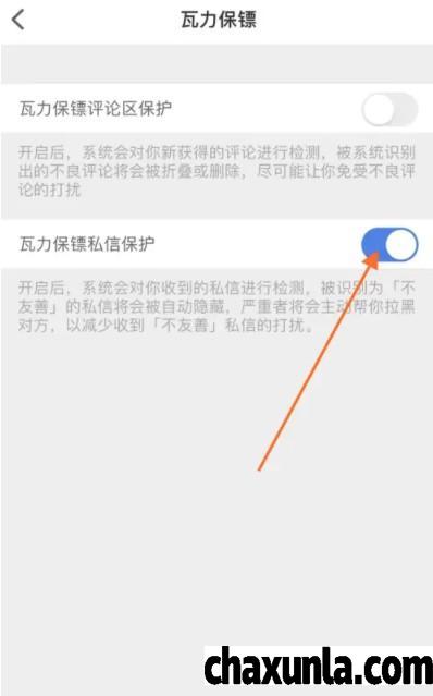 打开界面后点击开启【瓦力保镖私信保护】选项,即可。
