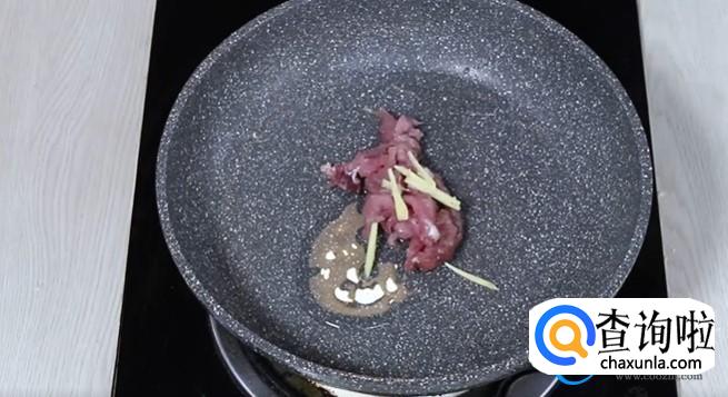 空锅将锅烧热之后再倒入适量的食用油,油热之后再放入肉丝生姜将其快速的搅拌均匀。