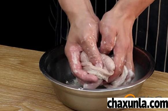 猪肚也需要事先清理干净,在清理猪肚时需要将猪肚放到盆中,盆中放入适量淀粉,少量的油不断的搓洗,通过搓洗,能够将猪肚清理干净之后,将其放到一边备用。