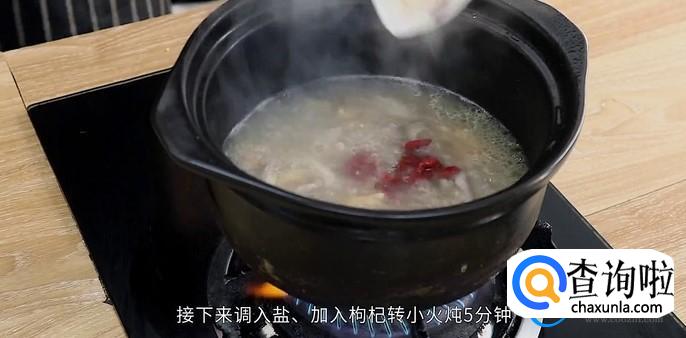 之后直接将猪肚墨鱼放到砂锅中,锅中放入适量的清水大火炖30分钟。接下来再放入食盐枸杞转小火,慢慢的炖5分钟,此时撒上事先准备好的葱花即可出锅。