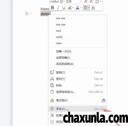 右击出现菜单栏,点击字体。