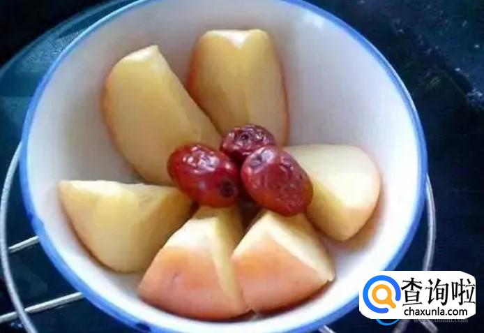 在选择蒸苹果的时候,取一个新鲜的苹果,将苹果表面清洗干净,控干水分,去掉苹果的核,并从中间直接将苹果给切开,然后将果肉切成块摆放在盘子当中,盘子里面放入适量的红枣,直接在锅里面蒸苹果。