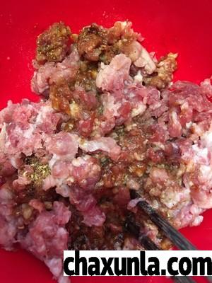 猪肉馅儿加盐、料酒、蚝油、生抽、花椒粉、白胡椒粉搅拌均匀味10分钟。