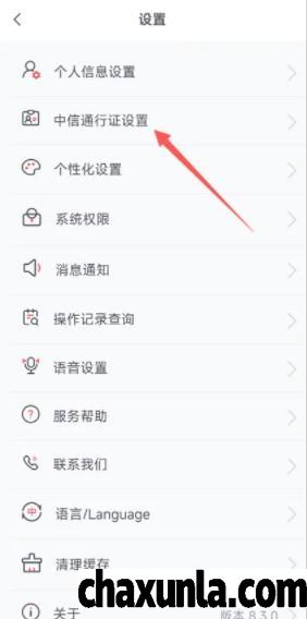 打开【设置】之后在当前页面找到【中信通行证设置】