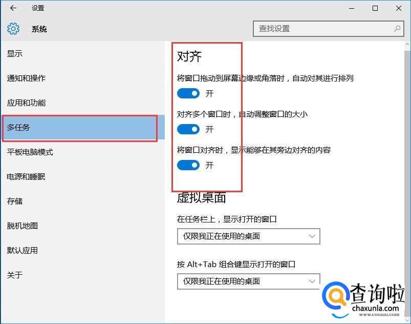 步骤三:在系统栏中,选择多任务选项并打开;将对齐下方的开关关闭,即可