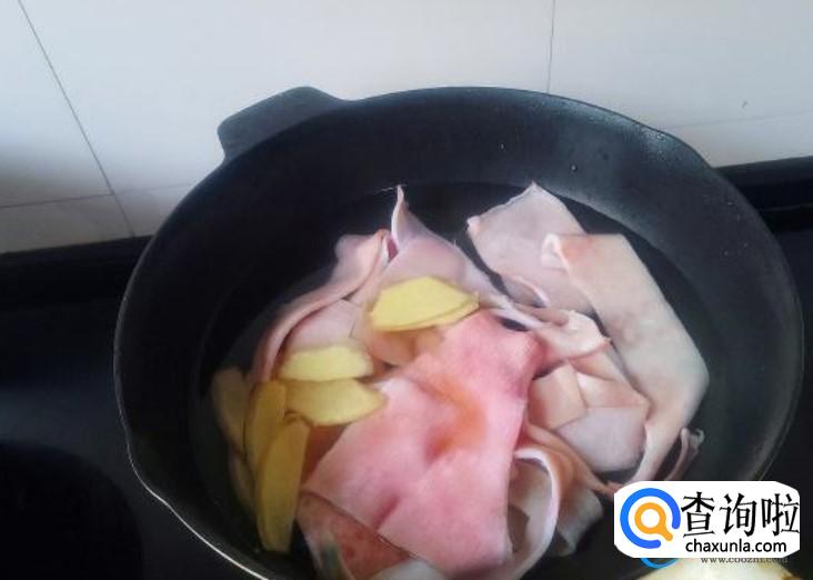 当猪皮完全清理干净之后,闻一下猪皮是否还有腥臭味。如果有腥臭味,建议将猪皮放入锅中再次进行焯水,在焯水时放入生姜片、葱段、八角,再加入高浓度的白酒去除腥味。
