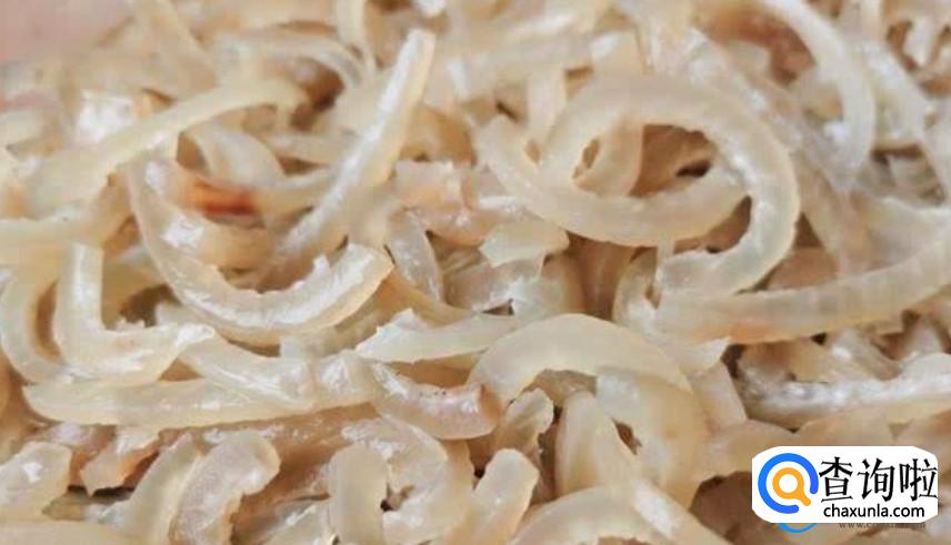 当猪皮完全清洗干净之后,切成线条再次清洗,在制作的过程当中,可能在处理猪皮方面是比较麻烦的,因为猪皮处理不干净可能会出现腥臭味。