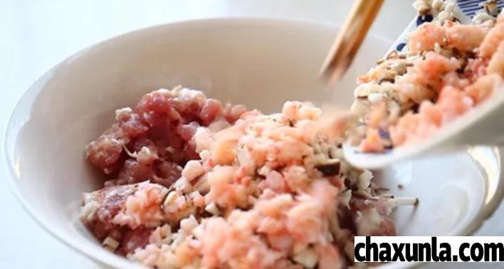 把加拿大北极虾香菇,猪肉都剁成肉馅,搅拌均匀放入调味料。