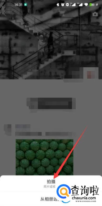 在朋友圈界面点击右上角的相机图标,在弹出的窗口中点击【拍摄】。