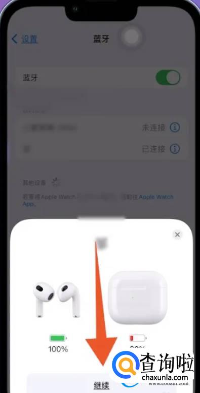 手机弹窗将会显示出耳机电量,点击【继续】即可连接了。