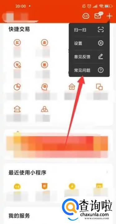 第二步,在个人中心点击右上角加号,在弹出的窗口中点击【常见问题】。