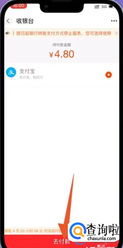 在收银台的页面中,找到页面中的去付款并点击,出现窗口。