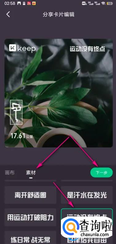 点开素材,选择对应的文字内容,点击下一步即可。