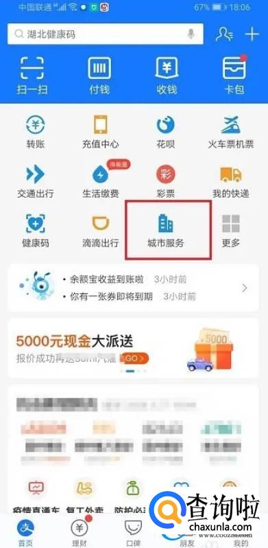 第一步打开支付宝,点击首页的城市服务