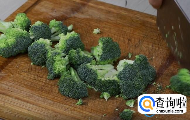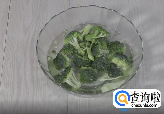 将事先准备好的西兰花,直接切成小朵的西兰花,然后用食盐水进行浸泡,一般浸泡10分钟左右即可捞出控干水分。