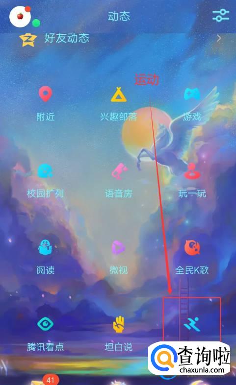 首先打开我们的手机QQ,点击动态页面,然后你就可以看到运动模块,点击它就可以进入运动页面了,如下图所示。