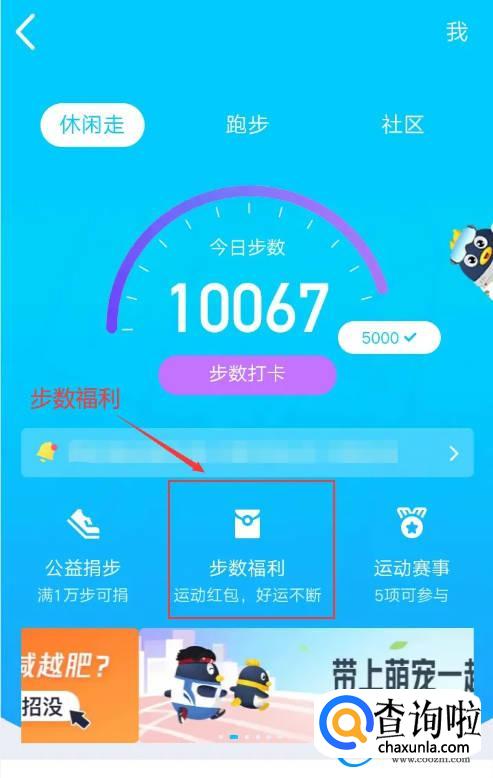 在QQ运动界面,可以看到一个步数福利模块,如下图所示,点击进去,这就是领红包的地方。