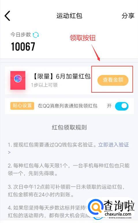 在运动红包界面有一个立即领取的按钮,因为小编今天已经领取过了,所以显示的是查看金额,如下图所示。