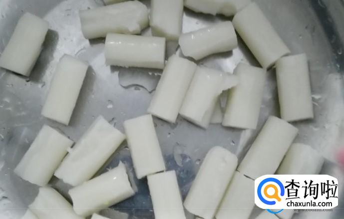 此时锅清洗干净之后加水,烧沸腾之后,再把年糕放到锅里面煮5分钟。之后需要将年糕捞出过凉,控干水分放到一边备用。