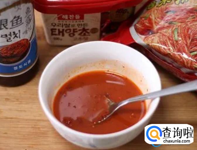 大蒜去皮拍过之后直接切成蒜蓉,此时准备一个小碗,在碗中放入韩式辣椒酱、辣椒粉、生抽、白糖、蒜蓉、清水,然后将其搅拌成料汁。