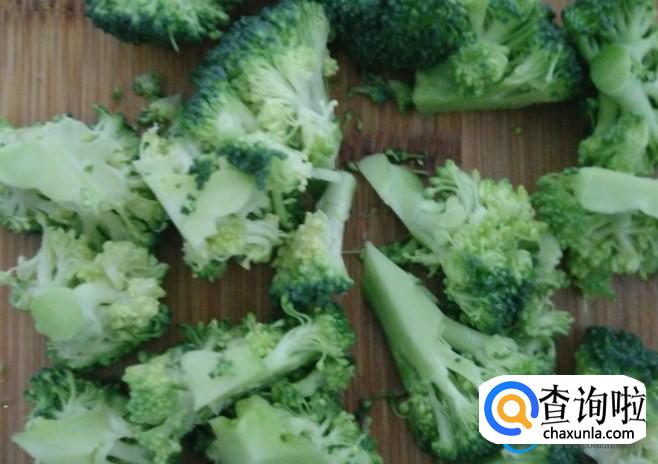 西兰花掰成小花之后清洗干净,控干水分,然后再将西兰花放到沸水锅中,焯水30秒钟,然后将西兰花捞出放到一边备用。