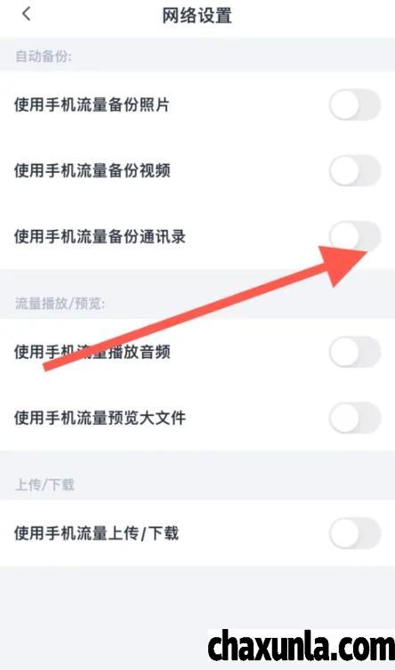 打开“网路设置”之后找到“使用手机流量备份通讯录”并打开选项,即可。