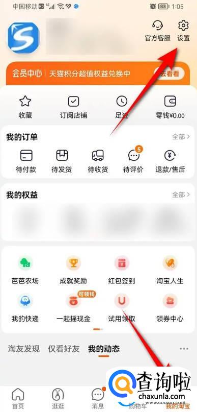 打开我的淘宝页面,点击右上角的“设置”小齿轮图标进入。