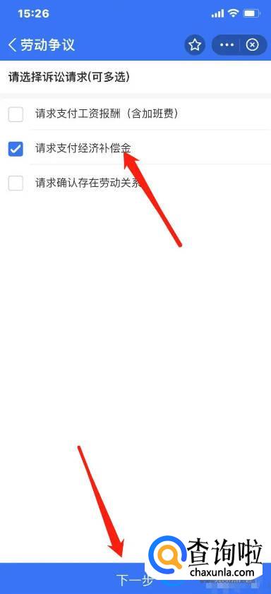 进入劳动争议页面,诉讼请求选择【请求支付经济补偿金】,点击【下一步】。