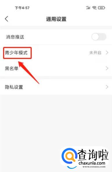 如图片所示。 咱们进入通用设置,点击(青少年模式),这样就好了。