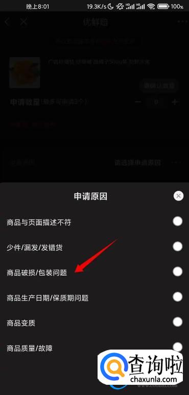 在底部弹出的列表中,点击商品破损包装问题的选项。