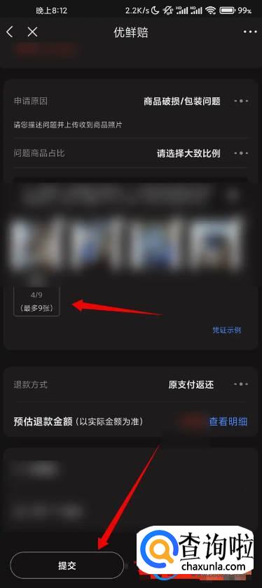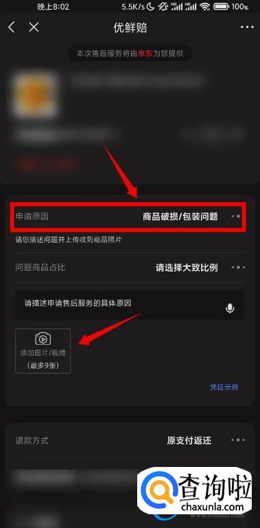 将申请原因一栏选中商品破损包装原因,点击相机图标上传证据图片。