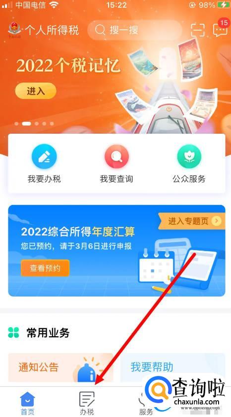 首先在个人所得税App首页面,点击【办税】。