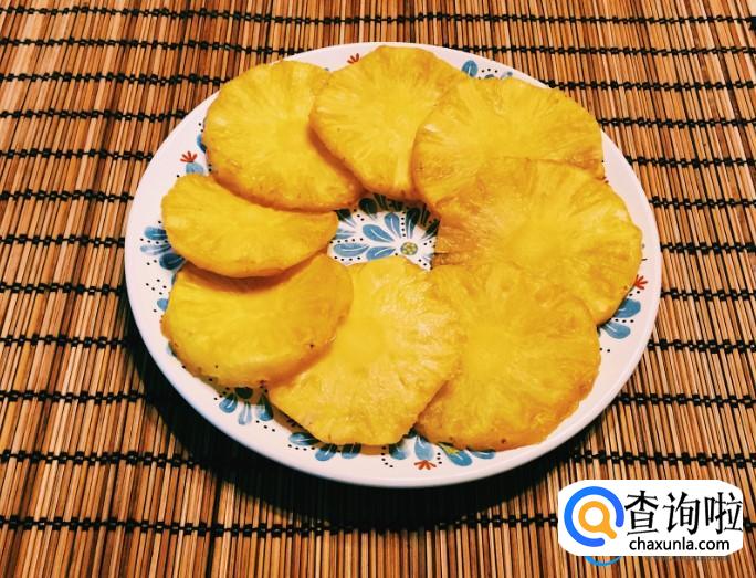 正常情况下选择烤菠萝时,应该将菠萝切成片直接烤。菠萝切成片之后,还需要用盐水浸泡10分钟。将菠萝捞出,放到烤架上,用炭火慢慢的烘烤。人们一般选择烤菠萝的时候,由于菠萝片的厚度不同,放在烤架上烤菠萝的火力不同,最终烘烤的时间也会有所不同。