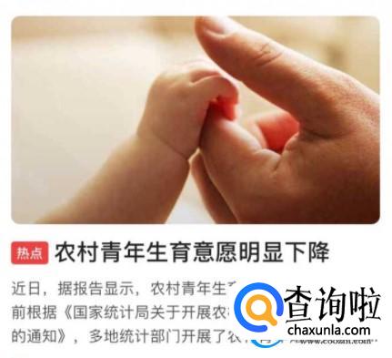 近日关于一则近三成农村去年无生育意愿的报告上了热搜。该话题也在网上引起了网友之间的热烈讨论,根据调查问卷分析结果,没有生育意愿的农村青年,比例已经高达了27.72%,这个数据相比较2021年宁波地区所统计的数据高了一倍。根据社会调查问卷,很多家庭有一胎生育意愿的占比数据为38.04%,愿意生二胎的家庭占比数据为32.49%想要生三胎或者是三胎以上的家庭占比只有1.75%。