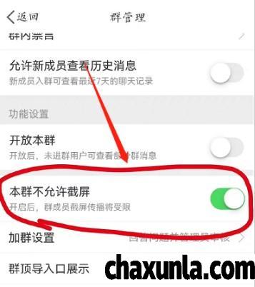 点开之后找到【本群不允许截屏】并开启该选项,即可。