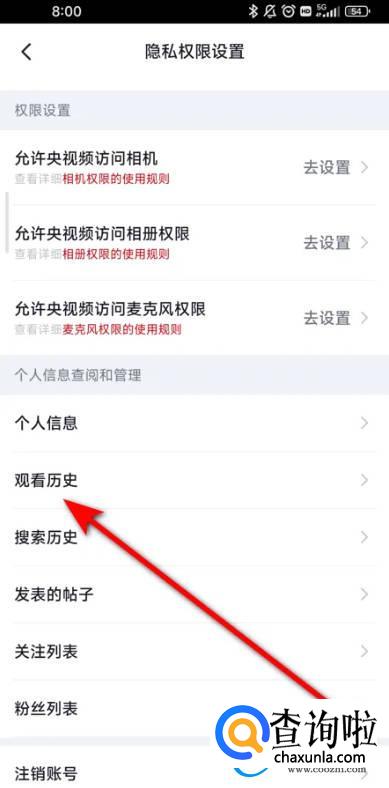 在打开的权限隐私设置中心选择【观看历史】,点击进入。