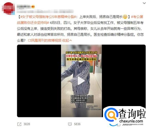 四川有一名女子在大学毕业之后并没有找到合适的工作,作为女孩的父母就要求女孩强制去考公务员,到现在为止已经第5年了,但女子考公务员却一直没有上岸,作为一个铁饭碗,未来的路也会更加稳当一些,女孩一直没有考上公务员,使得接连遭受了打击,在实在无法忍受的情况下,女孩有患上极为严重的精神分裂症,目前在精神病院去治疗这一病症。