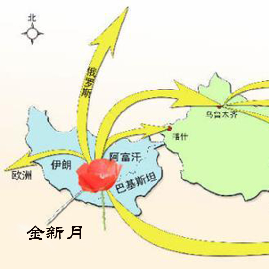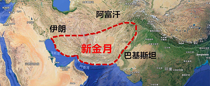 金新月指是阿富汗、巴基斯坦、伊朗这三个国家。金新月是一个仅次于金三角的鸦片和海洛因生产基地。位于阿富汗、巴基斯坦、和伊朗三国的交界地带,因形似新月,故名。