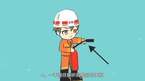 一手握住喇叭筒根部的手柄,另一只手紧握启闭阀的压把,对准上风火源根部进行扫射。注意要喷火焰根部。