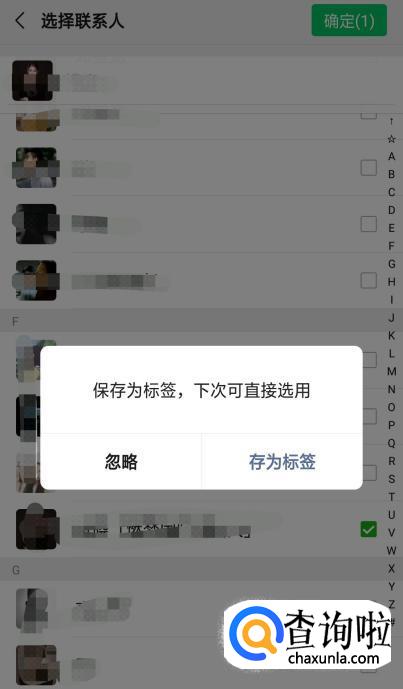 选择好后,页面会再次弹出一个页面提示,提示你可以保存你所选择的人的名单,下次发朋友圈的时候,就可以自动屏蔽这些人了,就不用一个一个的选规了。当然如果不愿意的话可以点击“忽略”。