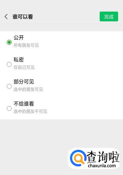 当我们点击“谁可以看时”,就会进入了另一个页面,页面就会跳出四个选项,然后根据你想要的公开的程度来进行选择就可以了。