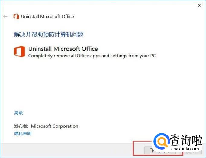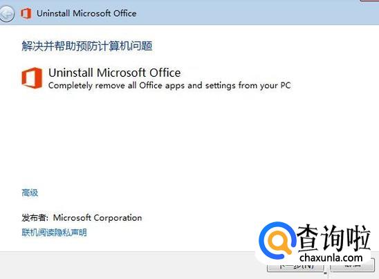 下载安装后,打开 O15CTRRemove.diagcab。点击“下一步”开始准备卸载并检测Office存在问题。