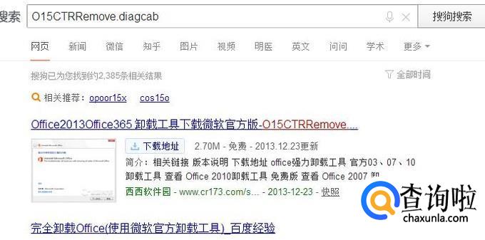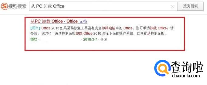 首先,使用搜索引擎搜索“从PC卸载Office”关键字,在搜索结果页面中,点击进入微软帮助与支持页面。