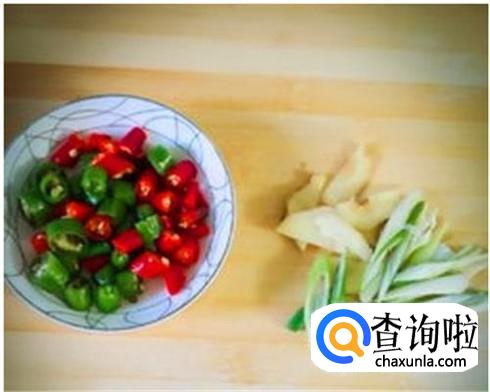 切一些葱段和一些姜丝亦或是姜片,喜欢吃辣的,切点青红椒,中间的辣椒种子不要。