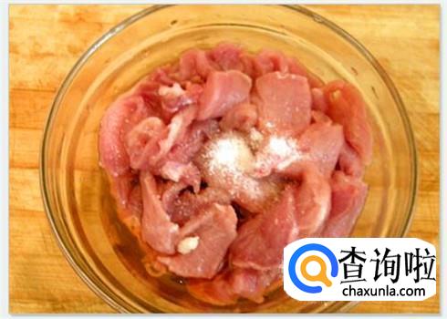 鸡腿菇炒肉选择的肉最好是猪肋条那儿的肉,这里的五花肉搭配鸡腿菇是最好的,清洗干净切肉片肉段或者长条都可以,加上生抽和蚝油腌制几分钟。