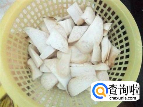 鸡腿菇选择新鲜一些的,那种放置时间久的就不要买了,鸡腿菇买回家之后清洗几遍,然后先切成段,再切成片,放淡盐水里浸泡五分钟捞出来。