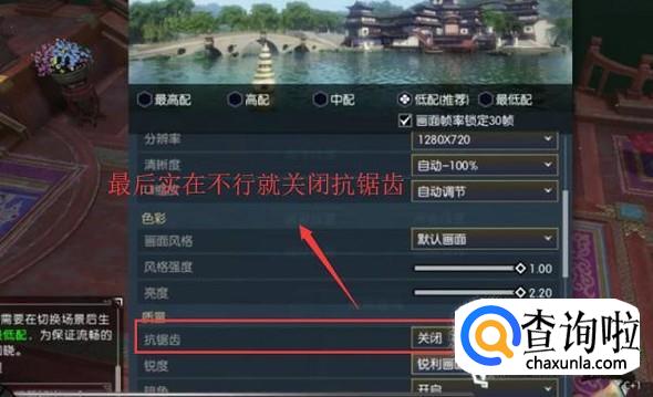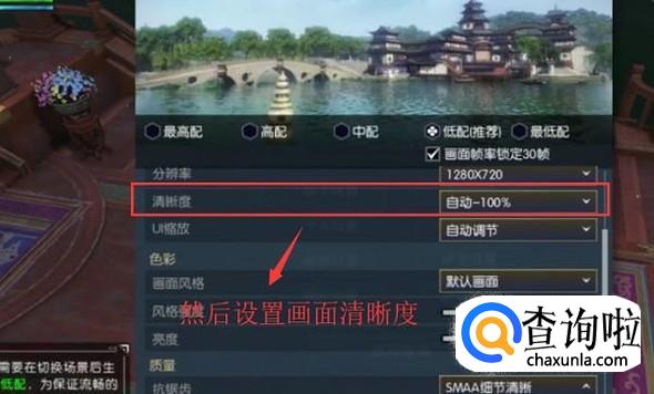 如果选择低配的画面还出现卡顿的话就降低一下画面的清晰度,如下图所示