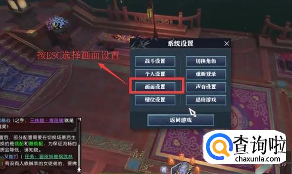 首先登录进逆水寒游戏,按ESC调出设置界面,然后选择画面设置,如下图所示